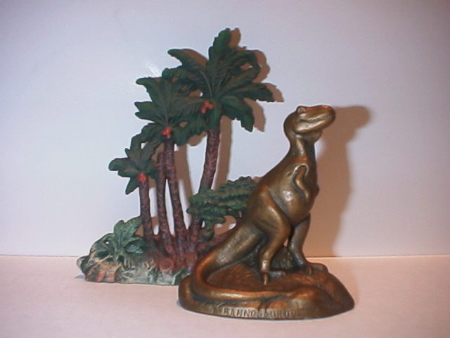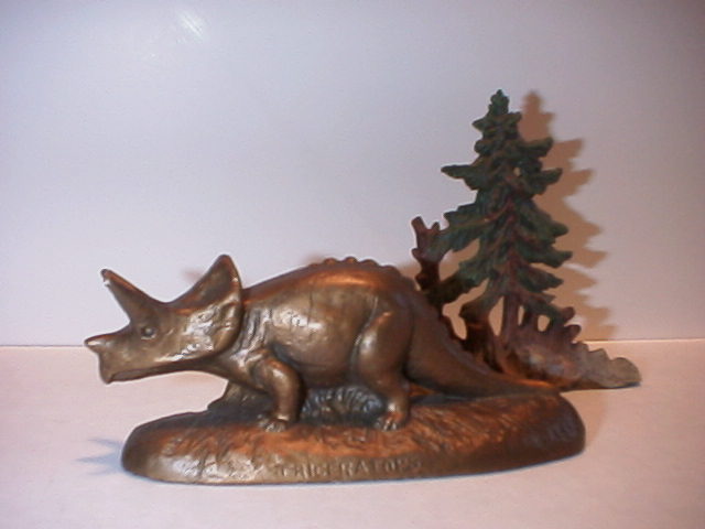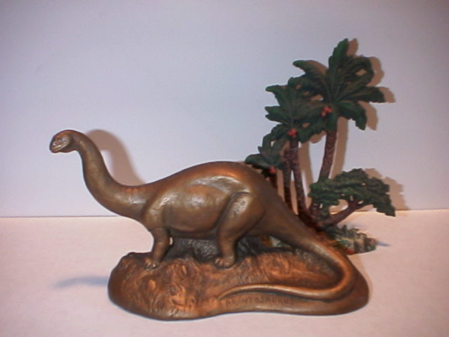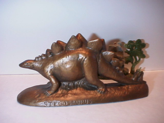 This is a set of four Dinosaurs by the Carnegie Institute of Pittsburg. They are made of Plaster and painted gold. On the bottom is inserted a metal tag that says Copyright 1947, Carnegie Instiute. Set includes Tyrannosaurus, Brontosaurus, Stegosaurus and Triceratops.