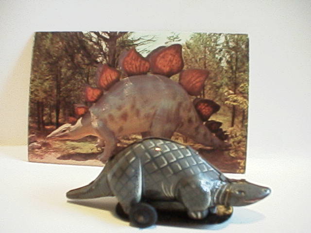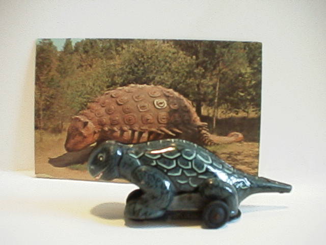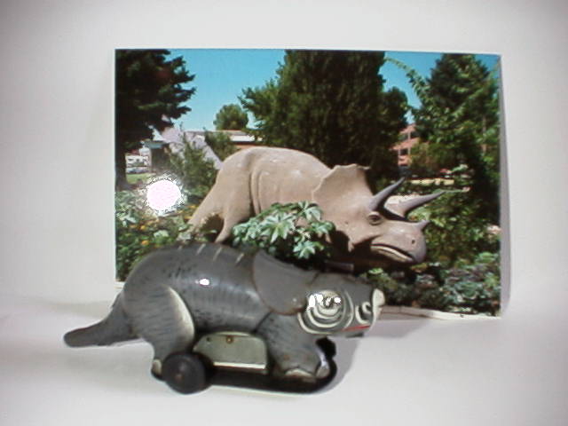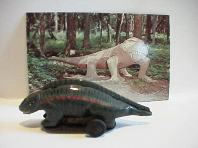Made by Line-Mar of Japan. 4 inches long. I only have 4 different but I am sure there are some more. They date from the late 1950's to early 1960's. Post Cards in the backgrounds are from various Dinosaur Parks around the Country.